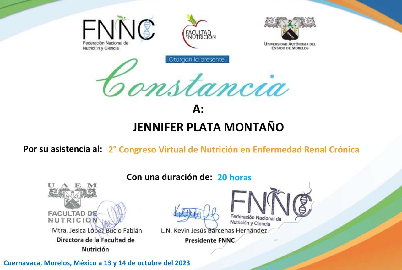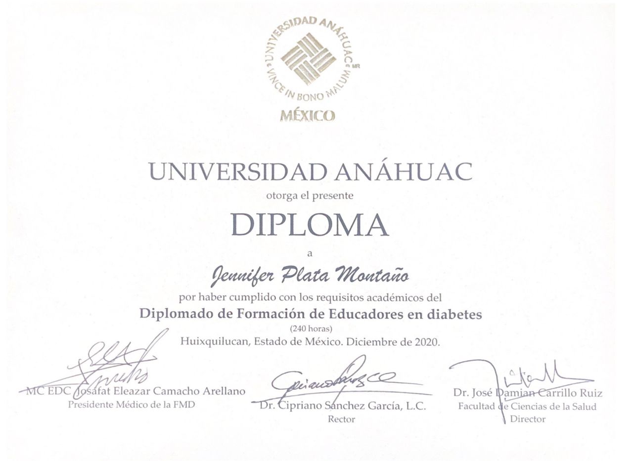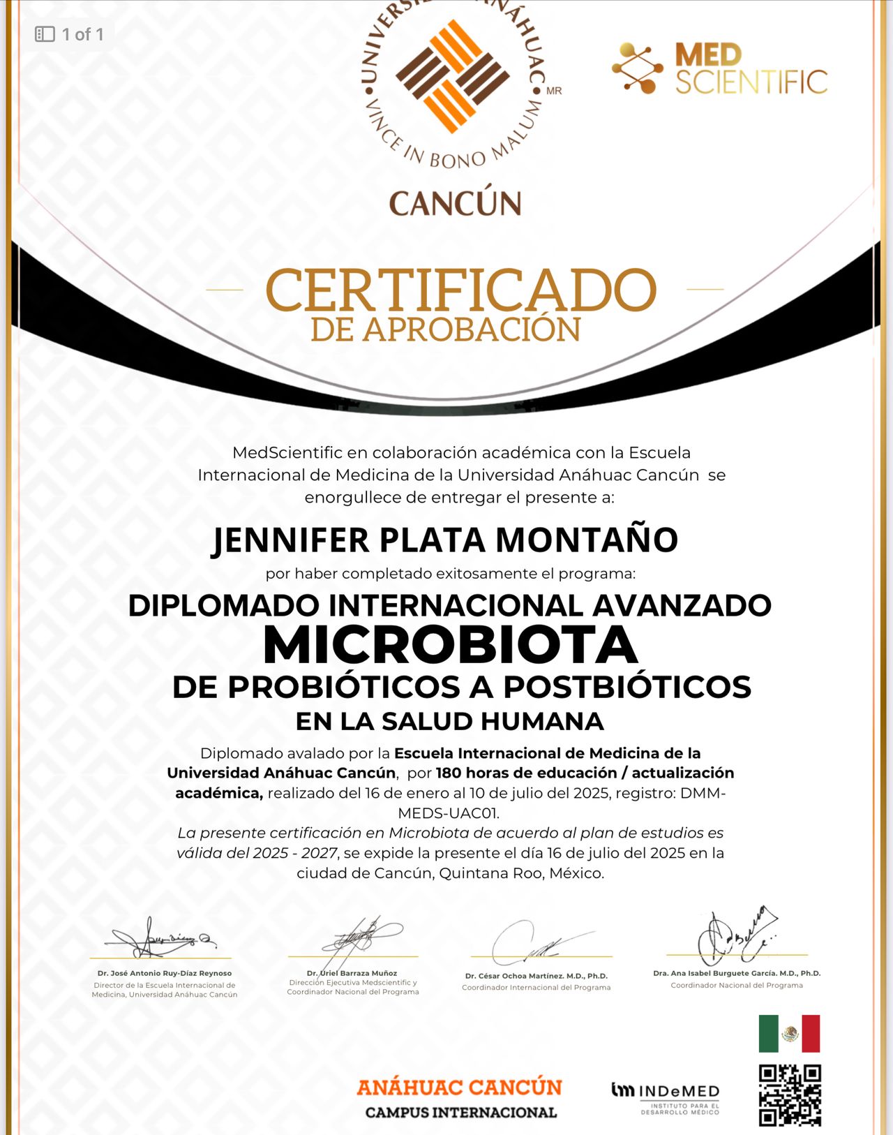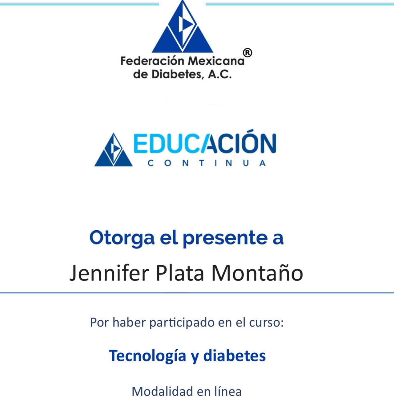Hola, mi nombre es Jennifer Plata, Soy Licenciada en Nutrición, Diabetóloga y Educadora en Diabetes Certificada, además de enfocarme en toda el área de Diabetes, tipo 1, tipo 2 y gestacional principalmente, también trabajo en el área de enfermedades cardiometabólicas (obesidad, hipertensión etc), cuento con múltiples diplomados y certificaciones en diferentes áreas, y soy Especialista en Microbiota y Salud Digestiva.